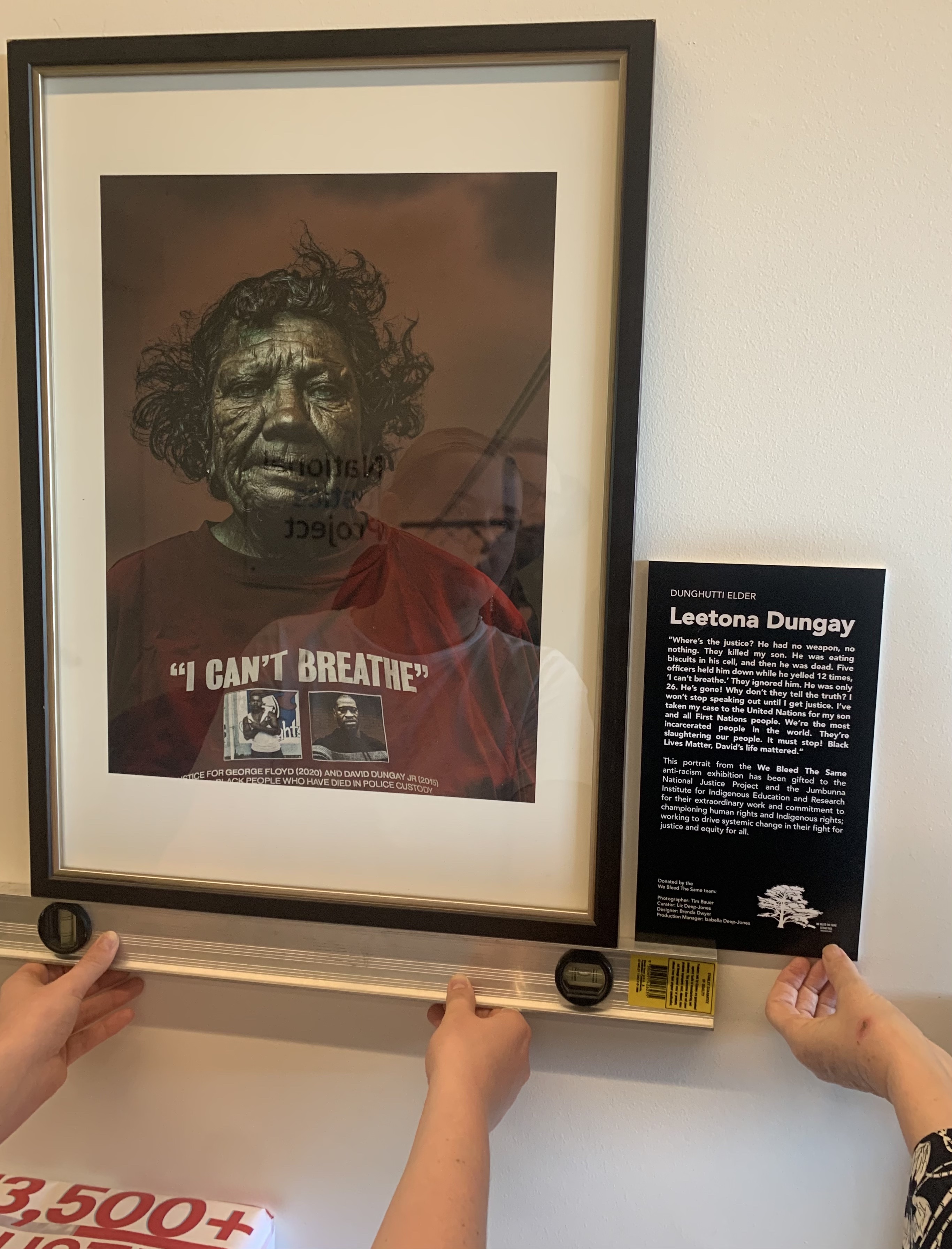 The 2023 Freilich Arts/Media and Activism Fellow, Liz Deep-Jones, and We Bleed The Same photographer, Tim Bauer, designer, Brenda Dwyer, and production manager Izabella Deep-Jones, joined with the extraordinary human rights lawyer, George Newhouse and his team at the National Justice Project and the Jumbunna Institute for Indigenous Research and Education at UTS to combat racism and work together to champion human rights.