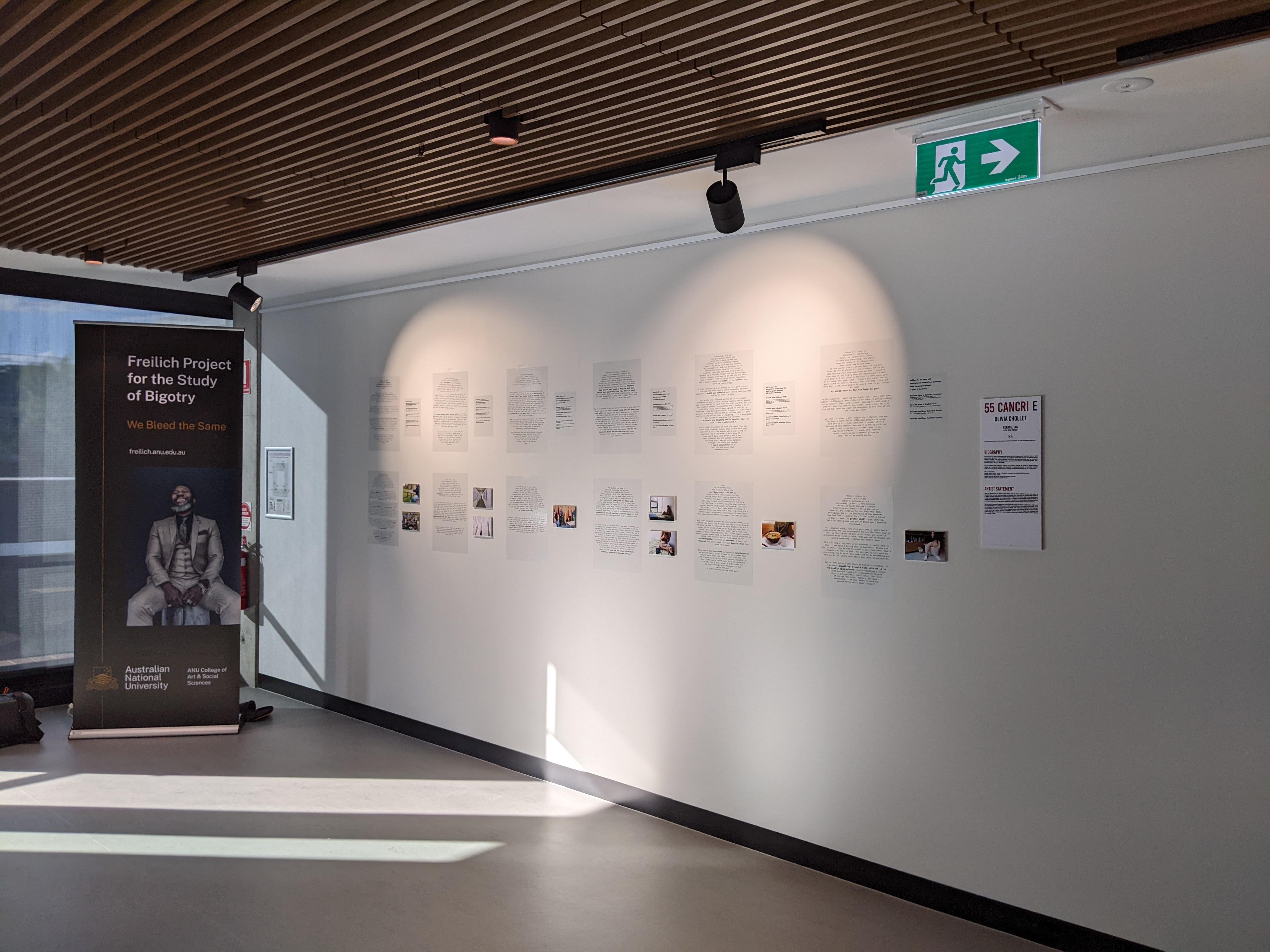 55 CANRI E is on show on Level 2, RSSS Building, ANU campus until February. The We Bleed the Same exhibition is also on show until February 2023, in the RSSS foyer, ANU. We Bleed the Same is an exhibition showcasing the moving portraits of many Australians who have experienced bigotry based on their race. The exhibition includes photographs by international photographer Tim Bauer and a documentary by Liz Deep-Jones. 55 CANCRI E has now been integrated into the We Bleed the Same exhibition and will be included in the future of the exhibition. We hope to have more to say on this in 2023.